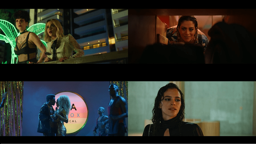 Por fim, gostaria de demonstrar que a série entrelaça suas linhas de ação, de forma que, mesmo sendo um roteiro composto de várias histórias, ele funciona como uma unidade, mantendo coesão entre as tramas que o formam. Durante a sequência que se passa entre 35m20s e 37m40s do quarto episódio, as moradoras do condomínio Maldivas estão no show da Veneno Tropical – banda formada pela outra protagonista Rayssa e seu marido Cauã – em comemoração à abertura de um spa. Porém, a noite de diversão é interrompida quando Milene, Verônica, Kat e Liz escutam sirenes de viaturas policiais se aproximando.