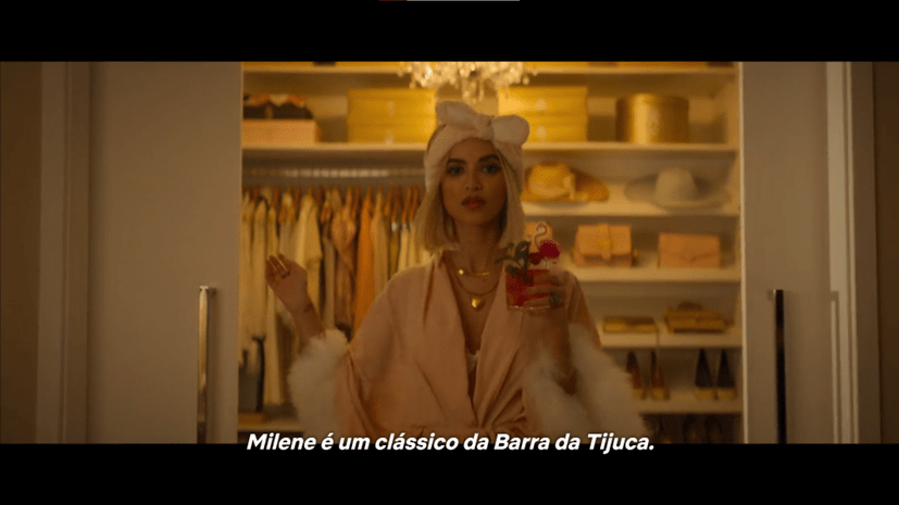 “Começando por Milene. Milene é um clássico da Barra da Tijuca. Caipivodca importada de lichia, sem açúcar. Milene tinha o corpo perfeito, o cabelo perfeito, o marido perfeito. Mas nem sempre as coisas foram assim. Quatro anos e muitos procedimentos atrás, essa era Milene. Milene se tornou a musa inspiradora de Victor Hugo. Sua obsessão, sua obra-prima, sua Vênus, antes dos braços dela caírem. E com os peitos muito maiores, obviamente. Mas, uma vez que a obra de arte fica pronta, o artista não tem mais o que fazer com ela. Tudo que lhe resta é ser admirada pelos outros. Ao se sentir rejeitada por Victor Hugo, Milene desenvolveu uma compulsão cada vez mais difícil de controlar. E cada vez mais difícil de esconder.” (T1E01, 2 minutos).