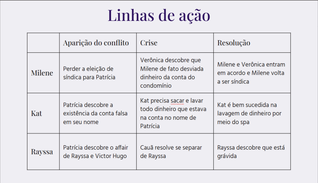 Por fim, além das inovações apontadas em relação a construção das personagens e linhas de ação narrativas, Maldivas também demonstra que não é uma história movida por um conflito externo dominante. Embora o suposto assassinato de Patrícia esteja presente, o que serve de engrenagem para o enredo são os conflitos internos das personagens principais. Especialmente, é a necessidade das protagonistas de proteger sua vida privada para manter sua imagem pública que move a trama