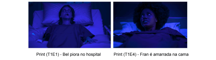 pela pele e apatia extrema. Além disso, eles são colocados em um grande quarto escuro e impessoal, e amarrados à cama, remetendo aos filmes de horror que retratam instituições psiquiátricas.